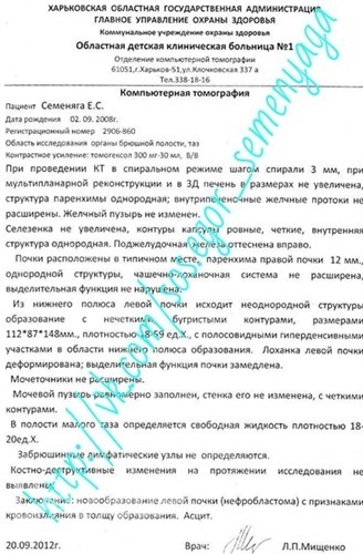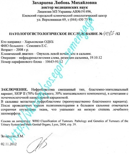 Все радости жизни резко оборвались в тот момент когда малыш начал жаловаться на боли в животике. Егору две недели лечили кишечные колики, результата не было. Мама очень переживала, искала причину плохого состояния сыночка. В конечном итоге мама с Егоркой приехали в Харьков на УЗИ к уважаемому специалисту гастро-энтерологу, но его направление повергло маму в ужас- врач рекомендовал обследование в онко отделении харьковской городской детской больнице. Ирочка, как сознательная мамочка в тот же день попала на приём к онкологу, были проведены все необходимые обследования и приговор- РАК. Егору было проведено хирургическое вмешательство по удалению левой почки, но это оказалось не предел всех мучений ребёнка, через 10 дней после операции у малыша поднялась температура. Опять реанимация... Егорушке была проведена ещё одна операция по удалению спаек. Сейчас мальчик востанавливается после операций, впереди у него 12 блоков химиотерапии, курс лучевой терапии и поддерживающая химиотерапия.