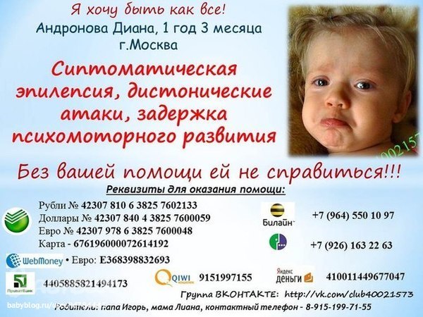 Позвольте рассказать Вам историю маленькой, но такой сильной девочки Дианочки. Это займет всего несколько минут и мы уверенны, что увидев один раз нашу красавицу, она поселится в Вашем сердце навсегда. История Дианы от мамы: «При рождении, сердце Дианочки билось, но она не сделала первый вдох. Врачи в течении 40 минут боролись за ее жизнь, и тут Диана задышала самостоятельно. Моей радости не было предела. Но на следующие сутки Диана впала в кому, ее подключили к ИВЛ. Врачи говорили, что Диана не выживет, не доживет до завтра. И так 5 долгих дней. Но, вопреки всем прогнозам, Диана вышла из комы и начала дышать сама. Потом у нее начались сильные судороги, Диана не глотала, поэтому ее кормили через зонд. И снова страшные прогнозы врачей, и слова, которые звучали, как пирговор: "Такие дети не доживают и до 3-х месяцев, ребенок будет растением и никогда не сможет глотать". Приступы были купированы . И снова, вопреки всем прогнозам врачей, Дианочка научилась глотать и кушать с ложки, хотя на это у нас ушел целый месяц. В 4 месяца у Дианочки начались новые судороги и мы попали в НПЦ Солнцево. Через месяц приступы были купированы. Врачи в НПЦ Солнцево не давали никаких прогнозов и говорили: «Мозг ребенка не предсказуем, нужно время и качественная реабилитация". В свои 5.5 месяцев она не делала ничего, даже не улыбалась. Мы стали усиленно заниматься с ней дома и наградой за нашу работу стала ее первая и такая долгожданная улыбка. Когда Диане было 11 месяцев мы поехали на реабилитацию в город Новозыбков, где занимались по методу Войта и Бобата. Потом сразу поехали в санаторий Новый в Чехии, где занимаются реабилитацией таких деток. На данный момент нам удалось много достичь: Диана стала много улыбаться, смеяться, начала узнавать свои любимые игрушки, следить за предметами, интересоваться окружающим миром. Диана стала узнавать близких, а особенно маму, чему я несказанно рада. Начала проявлять эмоции, обижаться. Благодаря эрготерапии, Диана научилась удерживать предметы, хотя не очень продолжительно, но для нас это огромный прогресс. Благодаря занятиям в бассейне с термальной водой, у Дианы немного снизилась спастика, она научилась плавать,ходить ногами по дну бассейна, хоть пока и на носочках. От термотерапии Диана начала меньше вкручивать ручки в обратные стороны. Благодаря занятиям Войта и Бобата, Диана научилась переворачиваться с боку на спину, непродолжительное время удерживать голову лежа на животе, и делать опору на руки. Сейчас Диана начала произносить свои первые слова: Да,Дай, НЕТЬ, Ба, Ма, Бу, Ням, Нан....Врачи Дианочку считают перспективным ребенком, но ей необходима постоянная высококвалифицированная качественная реабилитация. Вы только представьте, сколько всего умеет наша девочка после двух курсов реабилитации.» Это только на первый взгляд кажется, что научилась она элементарным вещам, но для нее и ее семьи это огромный прогресс. Давайте все вместе сделаем так, чтобы Дианочка не только переворачивалась и держала игрушки, а смогла подбежать к своей мамочке и обнять ее крепко-крепко.