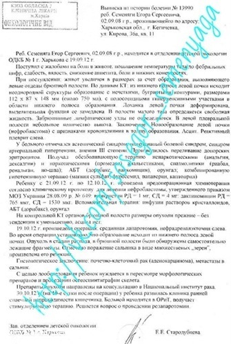 Егору две недели лечили кишечные колики, результата не было. Мама очень переживала, искала причину плохого состояния сыночка. В конечном итоге мама с Егоркой приехали в Харьков на УЗИ к уважаемому специалисту гастро-энтерологу, но его направление повергло маму в ужас- врач рекомендовал обследование в онко отделении харьковской городской детской больнице. Ирочка, как сознательная мамочка в тот же день попала на приём к онкологу, были проведены все необходимые обследования и приговор- РАК. Егору было проведено хирургическое вмешательство по удалению левой почки, но это оказалось не предел всех мучений ребёнка, через 10 дней после операции у малыша поднялась температура. Опять реанимация... Егорушке была проведена ещё одна операция по удалению спаек. Сейчас малыш восстанавливается после ещё одной операции по установке порта. Третий по счёту наркоз Егорка перенёс очень тяжело. Впереди у него 12 блоков химиотерапии, курс лучевой терапии и поддерживающая химиотерапия.