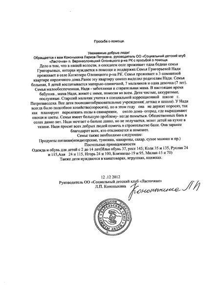 Обращается к вам Кононыхина Лариса Петровна, руководитель ОО «Социальный детский клуб «Ласточка» п. Верхнеолонецкий Олонецкого р-на РК с просьбой о помощи.