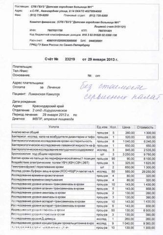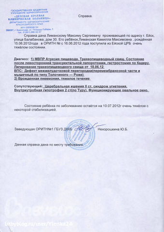 Маленькой Камиллочке. Это ребенок наших друзей. Со слов мамы: "Родилась девочка в г.Ейске с атрезией пищевода.На вторые сутки сделали операцию,но свести концы не удалось.Два с половиной месяца провела в реанимации на ИВЛ.Сейчас стоит гастростома и эзофагостома.Из стомы пища подтекала.Ложили ее только на один бок.Из-за этого проблемы с позвоночником.Теперь девочка,стала активней и при любой попытке ее посадить или когда она закашляет ,то пища бьет фонтаном.Иногда перевязка занимает двое суток,только так удается удержать пищу в желудке.А она плачет от голода и боли.Операцию обещали в год,но в Питере нас готовы принять в любое время.Стоит 585тыс.Все ресурсы уже исчерпали.Кто не остался равнодушным к нашей беде,откликнитесь!Заранее спасибо за помощь!!!