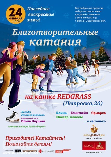 24 февраля, в последнее воскресенье зимы, Благотворительный фонд «БЮРО ДОБРЫХ ДЕЛ» и каток «REDGRASS» на Петровке 26 открывают Благотворительные катания. С 15:00 до 22:00 отличная музыка, мастер-классы, благотворительная ярмарка, блины, глинтвейн и не только.