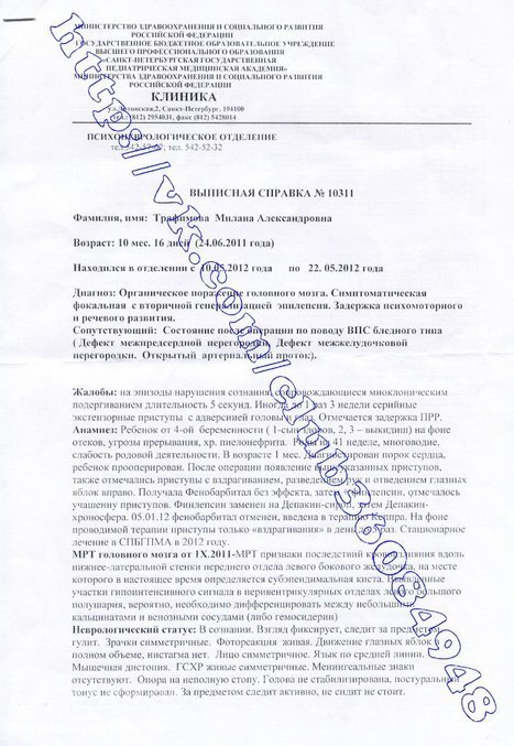 Диагноз: Симптоматическая фокальная эпилепсия, левосторонний гемипарез, микроцефалия, задержка психомоторного развития.