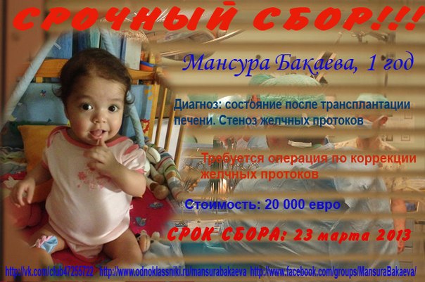 Мансурочка прошла сложный путь к выздоровлению. Чтобы спасти дочь, родители продали все свое имущество, заняли денег, но привезли дочь в Бельгию, где и была сделана спасительная операция по пересадке печени. Без этой операции Мансуры уже не было бы в живых.