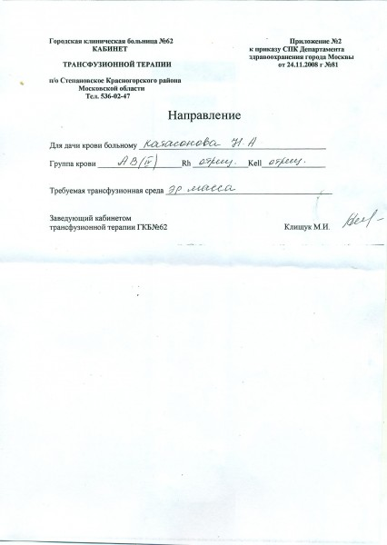 Направление нужно распечатать и предъявить на СПК, чтобы кровь попала именно к этому пациенту. потом нужно сообщить мне по смс код вашей кроводачи. мой телефон 8 916 3172031.