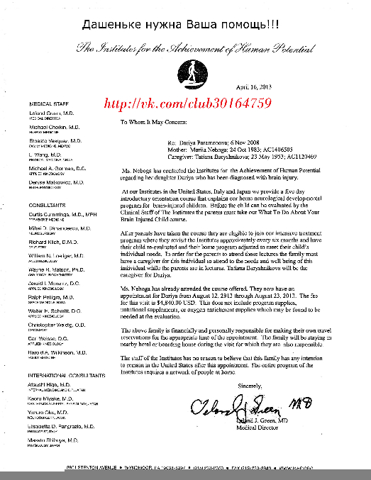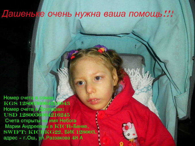 У Даши ДЦП тяжелой формы, мы боремся за ее жизнь всеми способами. Сейчас нас приглашают на консультацию в Институты Повышения Человеческого Потенциала Гленна Домана в США. В этом году я уже прошла первый курс лекций и вот уже три месяца мы с Дашей занимаемся по домашней программе Домана, которую я составила сама. Я занимаюсь с моей любимой доченькой 10 часов в день, самое главное - у нас есть результат! Но нам необходима эта консультация высокопрофессиональных специалистов! Даше скоро уже исполниться 5 лет, а она ничего не умеет делать сама, даже головку плохо держит. Но у нас уже есть определенные успехи! Например - она недавно в первый раз отреагировала на громкий звук. Она пытается полазать, мы учимся читать словами, по методике Домана. И если три месяца назад она даже не могла сосредотачивать взгляд на карточке и смотрела куда угодно, но только не на нее. А сейчас она уже смотрит! Оглядывается на людей, поворачивает голову на голос, и еще недавно я заметила, что она следит за моими пальцами, когда я провожу рукой у нее перед глазами. А ведь мне давно врачи сказали, что она слепая и глухая, и вообще безнадежный ребенок, и самый лучший выход - сдать ее в Интернат и жить дальше.