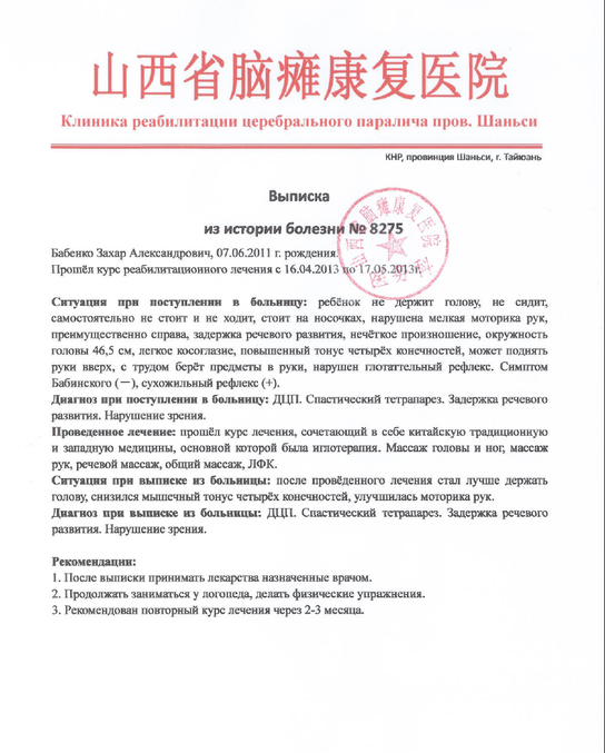 Д/з: ДЦП, спастический тетрапарез. Захарик прошел курс реабилитационного лечения в Китае, после чего, стали намного заметны улучшения, но необходимо еще продолжить лечение в сентябре 2013 года. Каждый перечисленный рубль – это шаг к выздоровлению Захарика. Заранее всем Вам спасибо.
