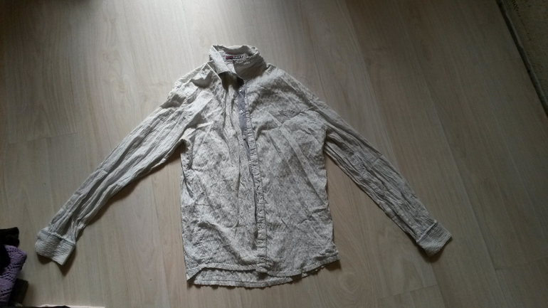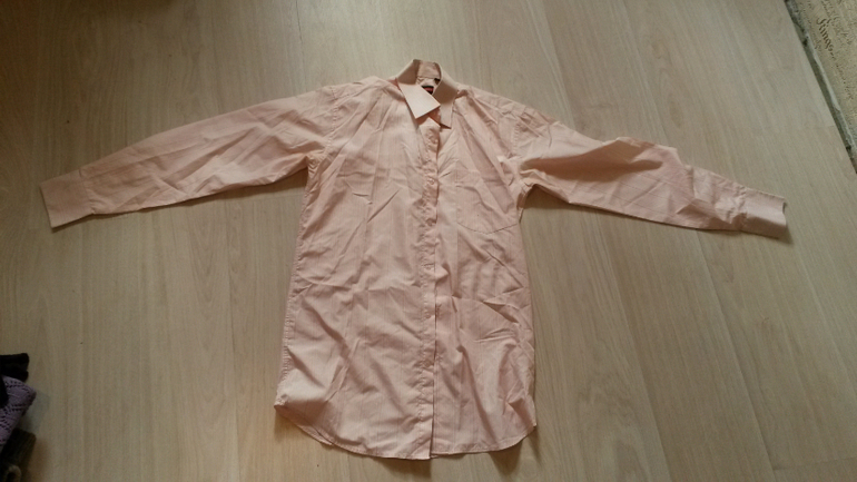 Рубашка, молодежного покроя (не широкая). Матреиал - слегка жатка (на фото сильно смята - только достала из пакета, где она погода пролежала). Размер 48. Длинный рукав.