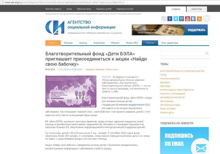 Акция направлена на поиск детей с буллезным эпидермолизом, распространение информации о заболевании и работе нашего фонда. Самые известные блогеры России, СМИ, соцсети размещают на своих ресурсах специально подготовленные информационные баннеры нашего фонда, чтобы как можно больше людей прочли о нас и смогли помочь нашим подопечным.