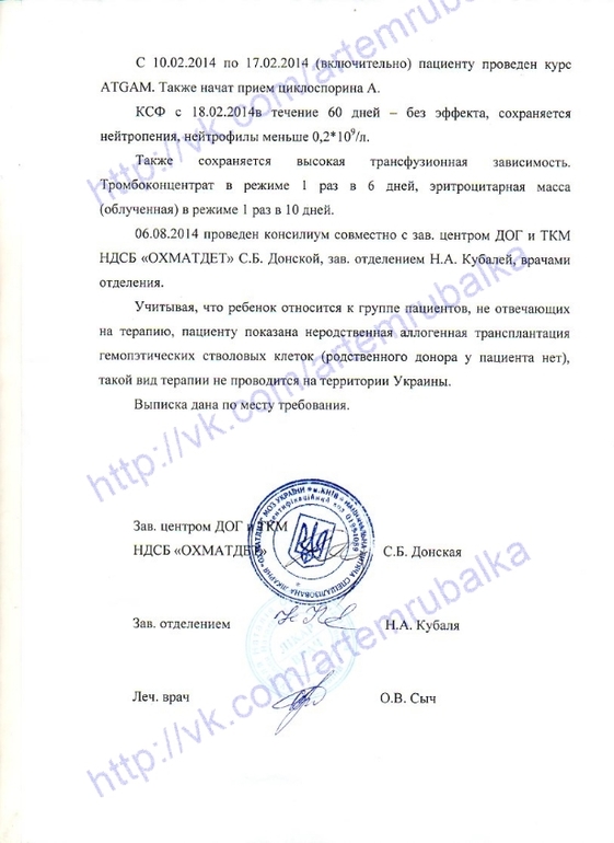 3.01.2014. Уже в тяжелом состоянии, Артема перевезли в Киевский Онкогематологический центр Охматдет. После длительного и тяжелого лечения, на оказанную терапию костный мозг не ответил, вследствие чего было показано неродственная ТКМ за границей, так как родственного донора нету.