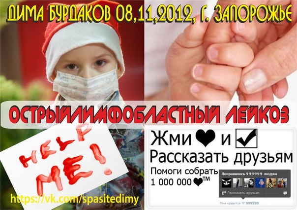 УкраинаПросим Вас о помощи! У Димы Бурдакова страшный диагноз - острый лимфобластный лейкоз(РАК)первый острый период. Мама и папа Димы не с богатых семей и у них нет огромных денег на лечение сына и им сейчас очень тяжело не только материально, но и морально. До болезни Димочка был очень светлым ребенком, как лучик солнца освещал все вокруг. Этот маленький малыш перенёс в своей жизни очень много боли , борясь за свою жизнь каждый день. Он сильный мальчишка и старается бороться ради своих родителей, но чтобы встать на путь здоровой жизни ему нужно получить дорогостоящее лечение за границей, а у родителей на это к сожалению средств нет.