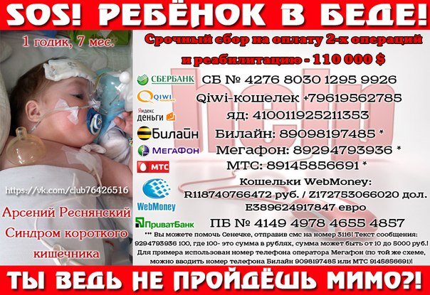 Добрые сердца! Нужна помощь маленькому Арсению! Родители продали все, бабушка и дедушка заложили дом, тетя малыша продала квартиру... А лечение нужно продолжить... Больше года малыш борется за жизнь! Диагноз: синдром короткого кишечника. За это время он перенес 14!!! тяжелых операций, но не прекращает отчаянно бороться за право ЖИТЬ! 20.07 Сенечке сделали плановую операцию по закрытию двух стом, а 24.07 ребёнка увезли на экстренную операцию из-за крошечных прорывов в кишочке и одну стому пришлось снова вывести, клиника выставила счета за 2 операции и реабилитацию и уже требует оплату. Если счёт Арсения в ближайшее время не будет оплачен, дальнейшее плановое лечение малыша будет приостановлено. Будет оказываться только поддерживающая медицинская помощь жизнеобеспечения малыша. Поможем спасти Сенечку! Любая Ваша помощь бесценна!!!