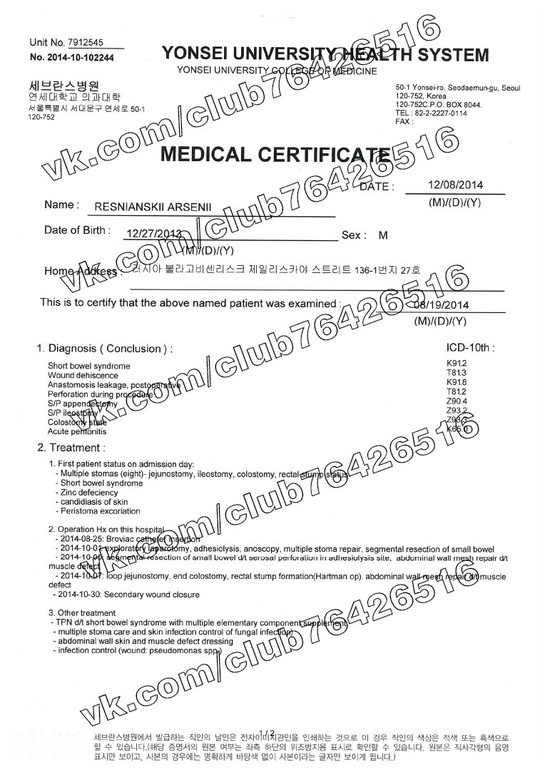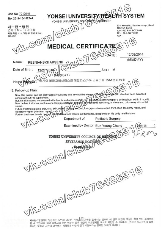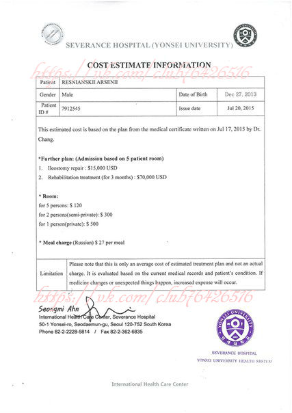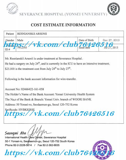Срочный сбор на оплату 2-х операций и последующую реабилитацию в клинике НИЦ Сэверанс Сун Чон, Сеул, Южная Корея Сумма сбора 110 000$