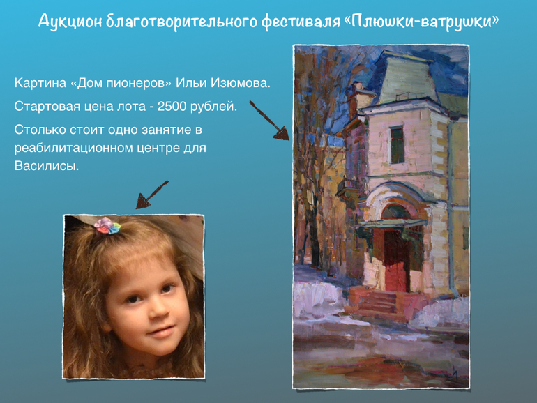 Мы помогаем Василисе и другим детям с особенностями развития. Приходите на фестиваль «Плюшки-ватрушки», участвуйте в благотворительном аукционе и помогайте детям вместе с нами. Один из лотов нашего аукциона - картина «Дом пионеров», предоставленная московским художником Ильей Изюмовым, поможет оплатить для Василисы реабилитацию.
