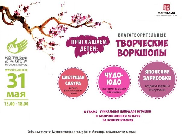31 мая не занимать! Этот день будет посвящен детям, творчеству и Японии! Приглашаем взрослых и детей. Взрослые отведают японские яства, а дети научатся создавать цветы ручной работы на настоящих ветвях, суши и сашими из волшебных пуговиц и еще мы сделаем к лету смешные закладки-монстрики, ведь внеклассное чтение никто не отменял :)
