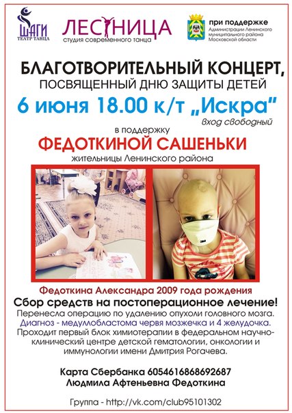 6 июня в 18.00 в к/т "Искра" пройдет благотворительный концерт в честь Дня защиты детей и в поддержку юной жительницы Ленинского района Сашеньки Федоткиной! Мы приглашаем всех увидеть замечательное выступление юных дарований из Театра Танца "Шаги" и студии современного танца "Лестница". Присоединяйтесь к группе в поддержку Саши Федоткиной, где мы будем информировать вас о сборах и держать в курсе всех событий -http://vk.com/club95101302