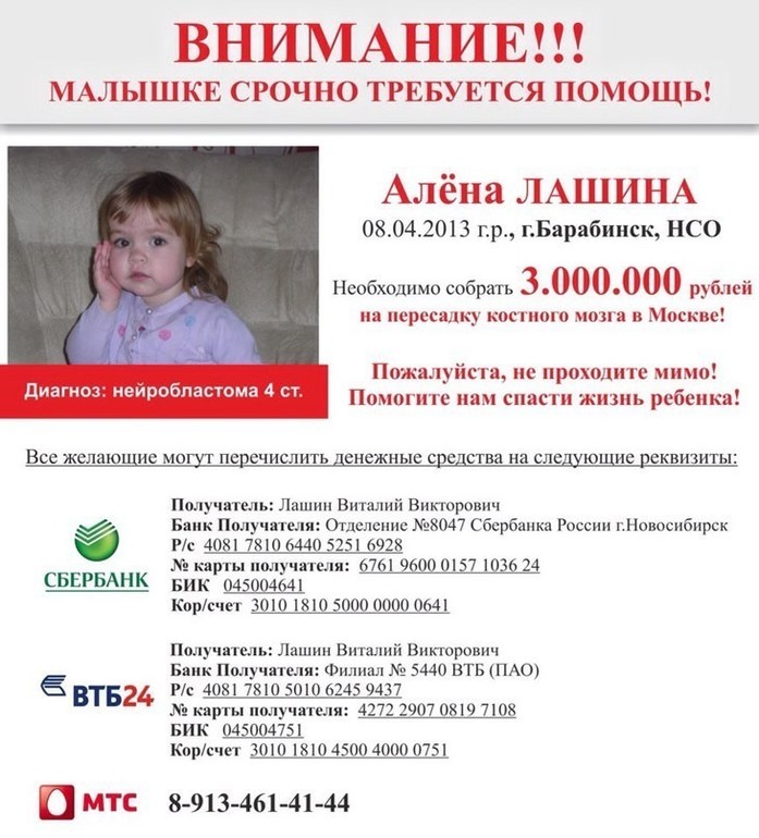 Лашиной Алёне 08.04.2013 г.р. для проведения дорогостоящей операции по пересадке костного мозга в Москве. КАЖДАЯ МИНУТКА НА СЧЕТУ!