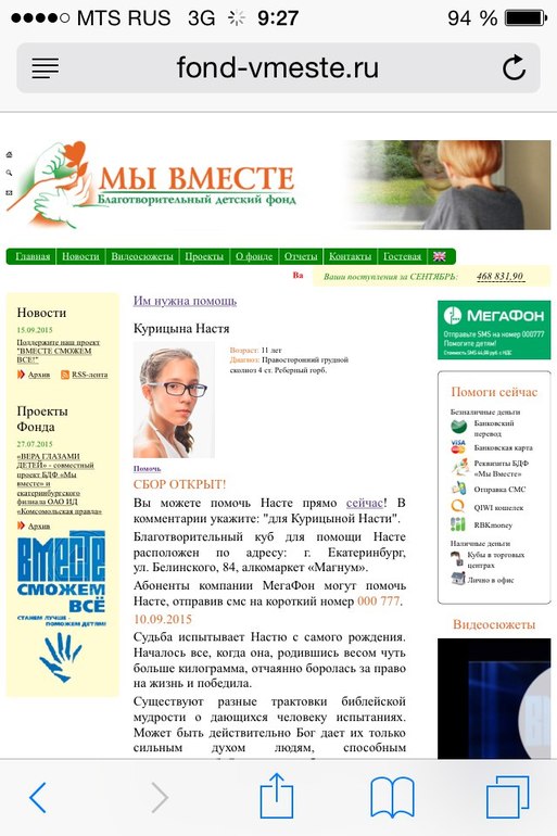 В будущем Настя мечтает стать врачом, рассказывает, что хочет помогать лечиться маленьким детям. Но сегодня как никогда помощь нужна самой девочке. Если в кратчайшие сроки не удастся собрать нужную сумму, Настя не сможет не только ходить, но и сидеть. 4 миллиона - огромная сумма. Ни одна организация скорее всего не решится оплатить такую сумму. А Татьяне, живущей с дочкой в небольшой комнате коммунальной квартиры, такую сумму взять просто негде. Средства для поездки Настеньки собирают всем миром. Дорогие наши, давайте сегодня и мы поможем этому ребенку. Даже небольшими суммами, потихоньку, с Божией помощью, обязательно удастся оплатить эту операцию.