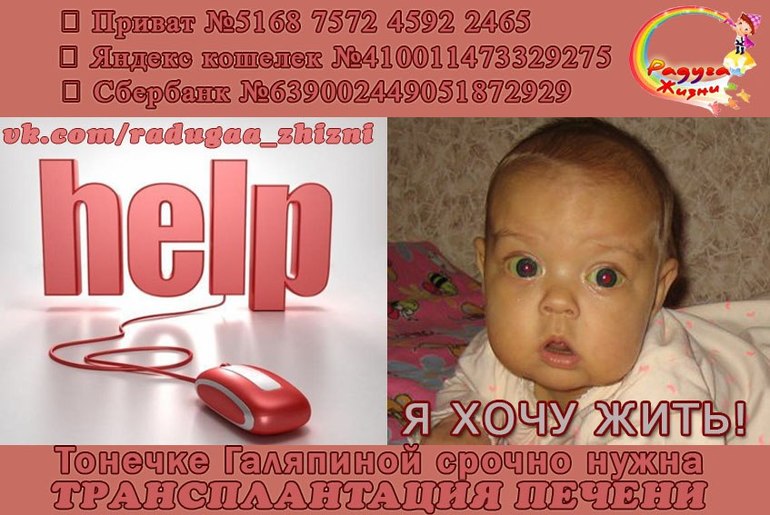 Нужна помощь для малявочки Тонечки Галяпиной. Ей всего 4 месяца. Ей срочно необходима трансплантация печени. Я не смогла пройти мимо этих глазенок. И вы не проходите мимо, пожалуйста, окажите посильную помощь, и сделайте перепост! Ведь это всего минутка вашего времени, лишние 100-200 рублей на телефон сбора для Тонечки +7(964)553 96 39, а для Тонечки - это шанс выжить! Пусть эта крошка живет!