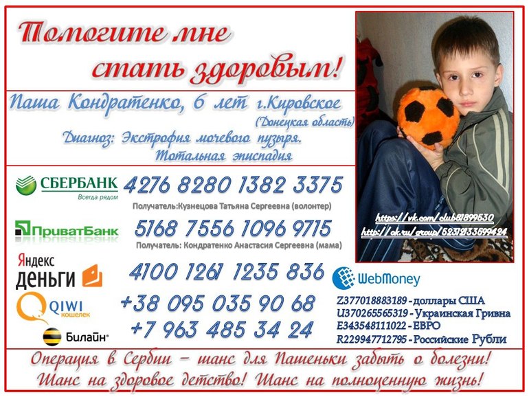 Пашенька родился 11 ноября 2009 г. с тяжелейшим врожденным пороком развития - Экстрофия мочевого пузыря (при этом пороке у ребенка отсутствует передняя стенка мочевого пузыря и соответствующая ей чревная стенка). За 6 лет своей жизни мальчик перенес более 30 оперативных вмешательств, но желанного эффекта не наступило - Паша до сих пор вынужден ходить в памперсах, а мочевыводящая система у него не функционирует. Осталась последняя надежда - на врача с мировым именем в области урологии Радоша Джиновича из Белграда. Он ознакомился с документами Паши и готов постараться исправить все ранее допущенные ошибки местных докторов. Но выставленная сумма в 10 тыс.евро непосильна для обычной семьи из Донецкой области - последний год выдался невероятно сложным и страшным...( Ничего не остается, кроме как просить людей откликнуться на призыв о помощи! Подарить этот такой необходимый и такой желанный шанс Пашеньке - стать ЗДОРОВЫМ!