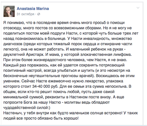 Вот приятельница,близкий человечек,пыталась месяц назад помочь в соцсети постом,но ничего у нас не вышло.Но мне приятно ,что я кому то все-таки не безразлична.Спасибо так же ,как всегда за посылочку и гостинца для малыша от Елена Чуркина.