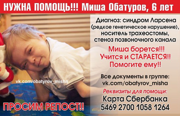 РоссияВ этом году Мише Обатурову исполнится семь лет. В этом возрасте Миша весит чуть больше 10 килограммов. Ларсена (редкое генетическое нарушение. Его признаки - вывихи крупных суставов, пороки развития скелета, искривление позвоночника, косолапость, низкорослость, дыхательные трудности и проблемы в функциональности конечностей.)