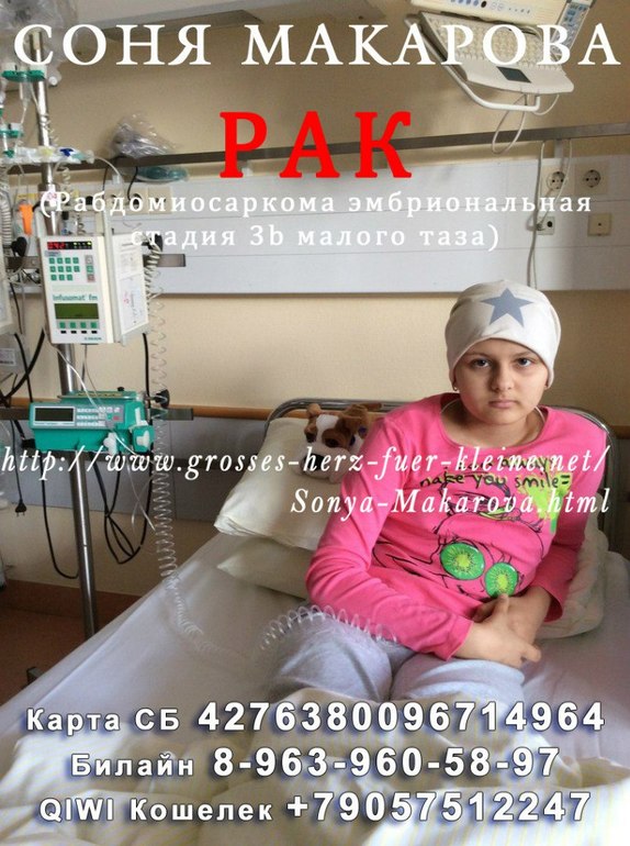 Но самое страшное - это полное отсутствие средств на лечение. 2 блока химии "съели" все средства. И счет ушел в минус. Клиника отказывается проводить третий блок при отсутствии средств. Общий счет за лечение 200 000 евро. Это огромная сумма для семьи Макаровых. Мама в одиночку растит двоих детей. Вся надежда только на добрых людей. Обращаемся ко всем - ситуация критическая, ждать нельзя! Даже 10 руб. будут спасительными! Их легко отправить на любой реквизит! Помогайте! Каждый рубль, каждая копеечка важны как никогда. Огромной помощью станет распространение информации! РЕПОСТ на свою страницу, рассказ о Соне другу, расклейка объявлений. ЛЮДИ, ВЫ ОЧЕНЬ НУЖНЫ ЭТОМУ РЕБЕНКУ!!!