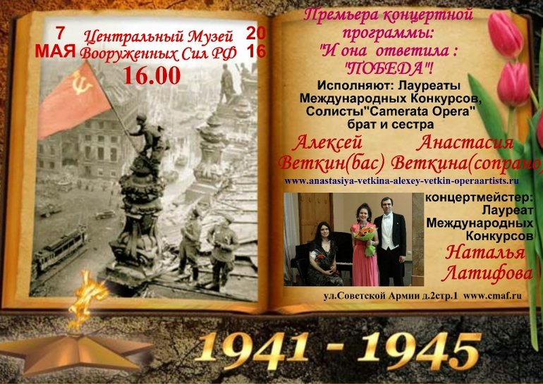 02. ОбъявленияПредлагаю бесплатную возможность посетить прекрасный концерт военной песни "И она ответила :"Победа!"-можно всей семьей!Премьера концерта с огромным успехом прошла 7 мая в Центральном музее вооруженных сил РФ.Место проведения - прекрасный и гостеприиимный Бунинский зал в шаговой доступности от ст.м. 1905 года .15 мая(воскресенье) в 18.30 .Концерт часовой.Естественная акустика,только живой звук от ведущих солистов Камерата Опера и Лауреатов Международных Фестивалей и Конкурсов - впечатления незабываемые!Программа необычная -состоит из всеми любимых и малоизвестных песен и дуэтов!