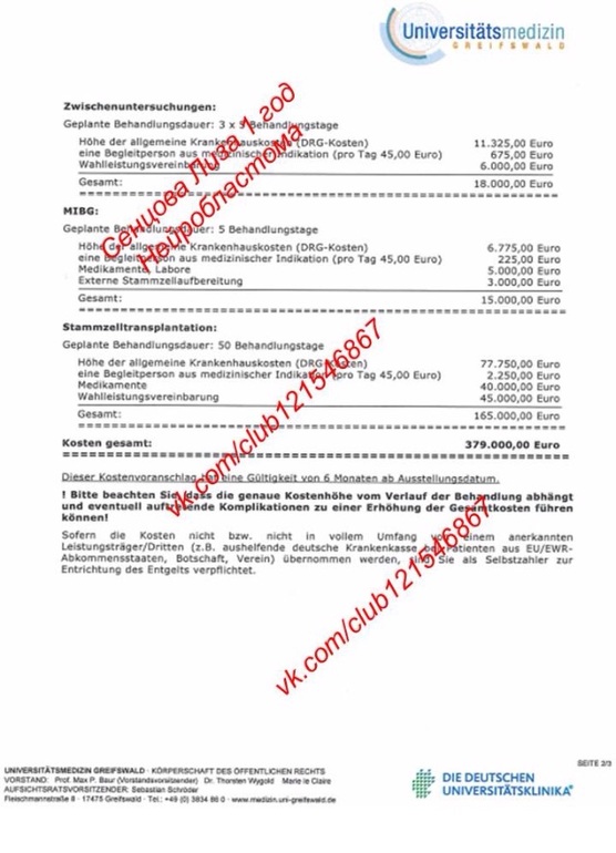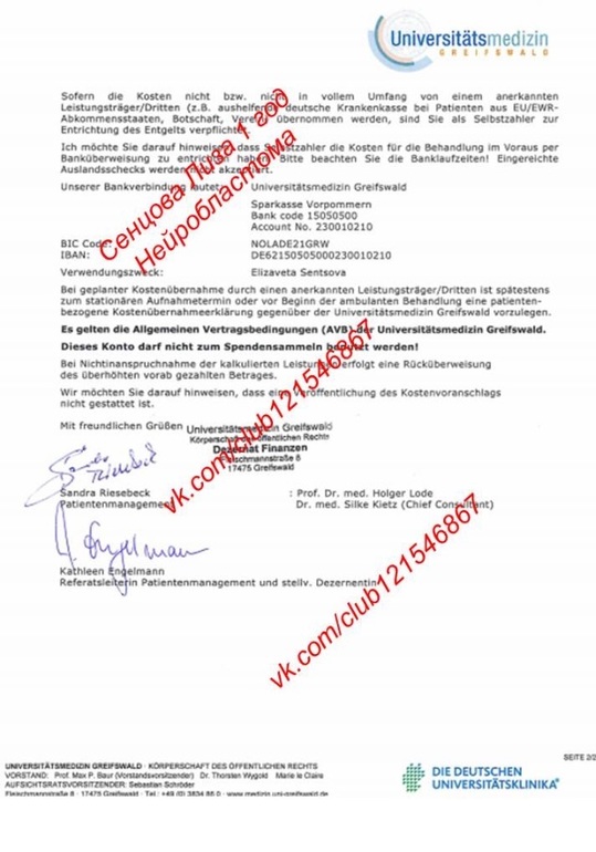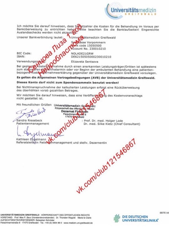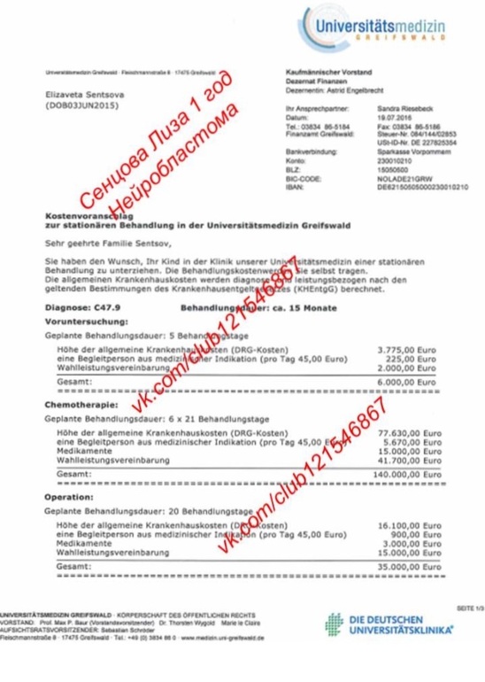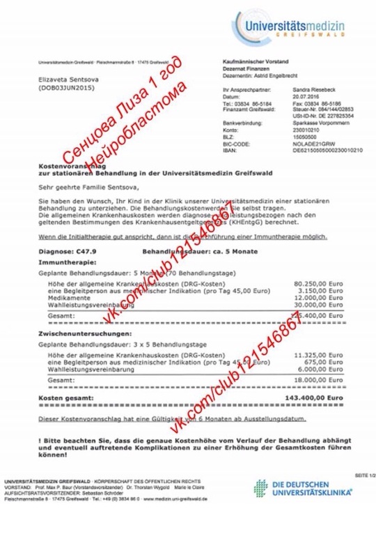 Университетская клиника г. Грайфсвальд (Германия) согласилась принять Лизочку на лечение. Стоимость с учетом лечения, пройденного в России, 429 400 евро. В том числе трансплантация стволовых клеток = 165 000 евро, иммунотерапия = 143 400 евро!!!