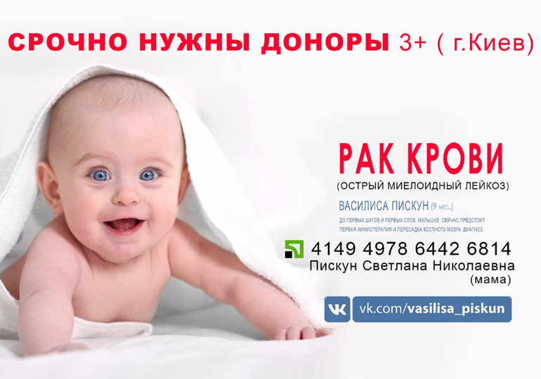 УкраинаЗнакомьтесь, это Василиса и ей 9 месяцев. 13 февраля 2017 года малышке диагностировали острый миелоидный лейкоз (рак крови), тяжелую и редкую форму. Документы тут https://www.facebook.com/groups/136001650251275/?pnref=story