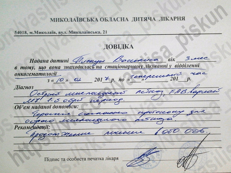 Ребенок сейчас находится на лечении в клинике "Охматдет"(г. Киев). Собираем сейчас средства для лечения и выздоровления. Ежедневный отчет о собранных средствах тут