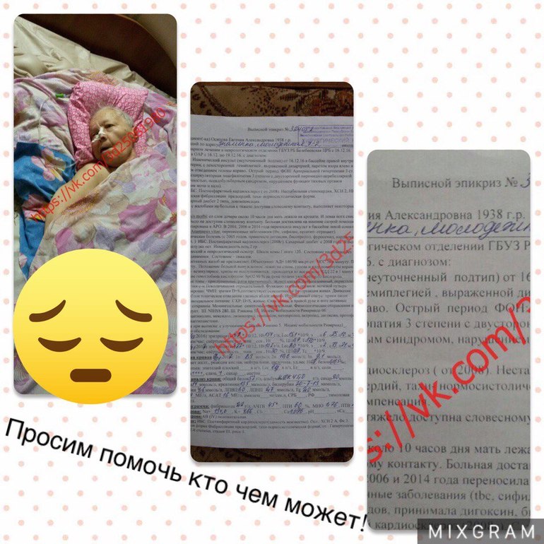 02. ОбъявленияСтрашно, когда болеют наши дети! Но не менее страшно, когда болеем мы - Мамы! Неважно сколько нам лет: 20, 40, 60, 80..... Важно, какое это горе для наших деток! Важно как они хотят облегчить наши страдания, как плачут у постели и просят не покидать, ведь Мы - дети, пока живы наши Родители!!!! В дом к Ольге постучалась беда! Ее пожилая мама, Осипова Евгения Александровна, тяжело больна! Диагноз: Ишемический инсульт в бассейне правой внутренней сонной артерии. Левосторонний гемиплегией с грубой дизартрией, парезом взора и тоническим отведением головы. Дисциркуляторная энцефалопатия 3 степени с двусторонней пирамидно-церебеллярной недостаточностью, псевдобульбарным синдромом, нарушением функции тазовых органов( недержание мочи и кала). Постинфарктный кардиосклероз и все это усугубляет сахарный диабет. Женщина прикована к постели, питается только через зонд! Местные врачи отправили старушку домой умирать, даже не выписав необходимых лекарств, т.к. они дорогие и возможности их купить всё равно не найдется! Мы не просим денег. Нужны подгузники (р-р 3), спец питание, мази от пролежней, одноразовые пеленки (очень много пеленок)!!!! Ольга на пенсии, на которую содержать лежачего больного очень тяжело и практически невозможно! Будем рады любой помощи!