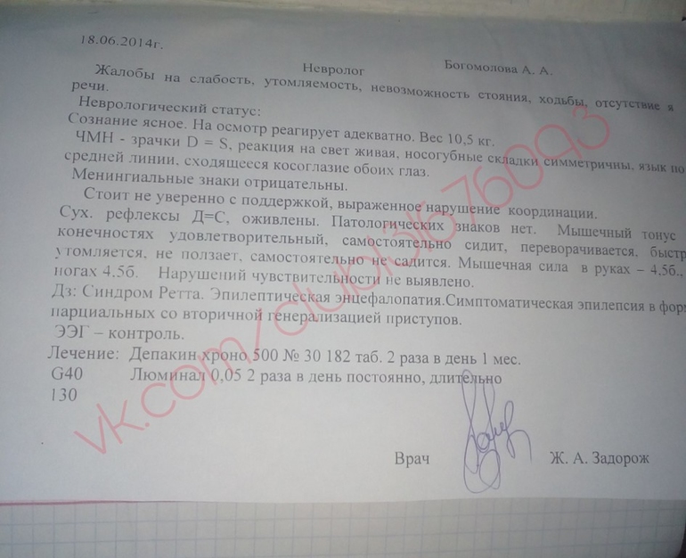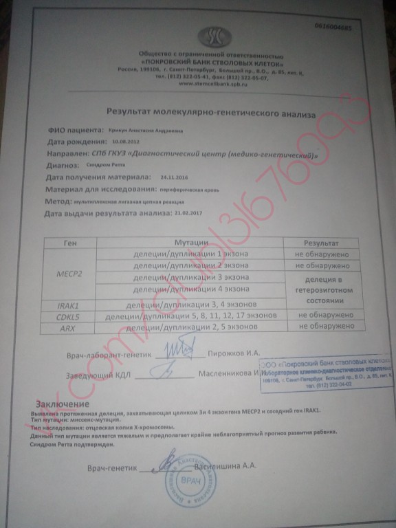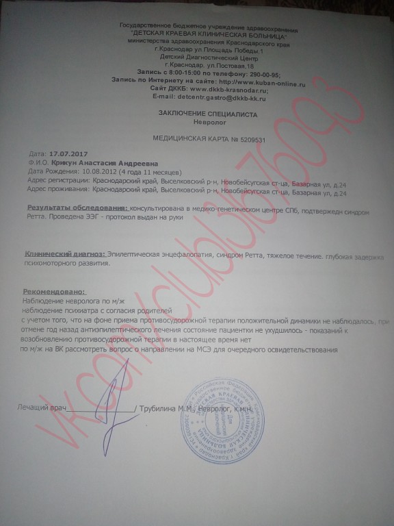 Настя родилась 10.08.2012 года. Рождение было тяжелым и длилось 7 часов. Вечером я уже увидела ее. Она была красной, отечно-узкоглазой и чрезмерно спокойной на фоне других детей. Мне показалось, что она понимает, как мне больно и сочувствует мне. Она смотрела мне в глаза и я почувствовала, будто между нами есть какой-то секрет. С годами этот секрет только вырос. Настя росла обыкновенным ребенком, произносила нехитрые слова к 8-ми месяцам, играла с игрушками, лукаво улыбалась родным. В годик нам сделали прививку АКДС. После нее мы слегли на 3 дня с температурой 40. Но, оказывается, это было не самое страшное. Настя постепенно выздоравливала, а педиатр сказала, что такая реакция на прививку бывает, не стоит сильно переживать. Но то, что стало происходить с дочерью после прививки просто не поддается описанию В течении месяца она потеряла все навыки. Перестала реагировать на нас с мужем и бабушку с дедушкой, перестала откликаться на имя. Игрушки ее вовсе не интересовали. Она только подолгу смотрела в одну точку. То, что мы пережили не передать словами. Просто нет ни в одном языке мира таких емких слов, которые выразили бы всю боль, страх, отчаяние и беспомощность. В нашей станице врачи с таким не сталкивались и растерянно пожимали плечами. Мы сдали кучу анализов, прошли все возможные обследования. Выяснилось, что мочу у Насти хоть пей, а с такой кровью можно и в космос лететь. Но время шло, а Настя все больше уходила в себя, выбрасывая нас из своего странного мира. Наконец, нас отправили на обследование в Краевой Детский Диагностический Центр г. Краснодара. Нами занималась Трубилина Марина Михайловна - чудесный врач невропатолог. Она отправила нас в Медико-Генетический Центр г. Краснодара, где нам и взяли кровь на анализ по подозрению на диагноз синдром Ретта. Диагноз нам подтвердили в возрасте 2 лет. Нет, это был не приговор, это был расстрел, после которого нас оставили жить... Прошло то трудное время, когда я металась из стороны в сторону, пробуя на дочери все известные методики. Наконец я остановилась и пришла к той точке понимания, что ни в одной стране и ни в одной клинике Настю не сделают такой, как все. Но все же кое-что сделать можно. Если не прекращать занятия по тренировке ходьбы и разговорной речи, то можно сохранить ее способность к передвижению. Я стала делать только то, что действительно необходимо. Уже очень много необходимого сделано собственными силами, но сейчас сумма сбора для реабилитации непосильна для нашей семьи..