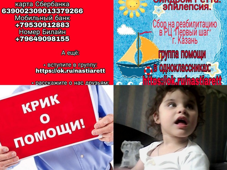 РоссияНастя Крикун, ДЦП, синдром Ретта. Здравствуйте, дорогие друзья! Обращаюсь ко всем, к кому только могу! Моей дочке Насте нужна реабилитация. Только при условии работы со специалистами она сможет сохранить и совершенствовать навык самостоятельной ходьбы и не станет лежачим инвалидом.