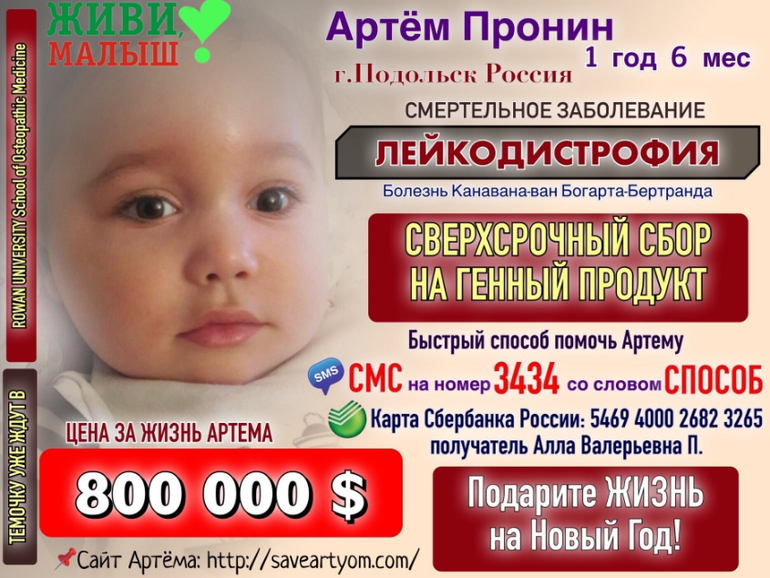 УНИКАЛЬНОСТЬ истории маленького Артёма Пронина в том, что он станет ПЕРВЫМ В РОССИИ ребёнком с таким диагнозом, получившим необходимую генную терапию. Сбор ведётся не только на лечение, но и на регистрацию метода лечения в системе FDA (Food and Drug Administration)