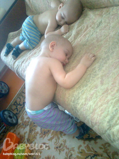 Вот как оно! Ночью спим плохо,приходится укачивать в коляске,сегодня решила не укладывать на дневной сон,думаю пусть нагуляются весь день,ночью может лучше спать будут. Время 12:00,что-то детки мои притихли...Захожу в комнату а там...полюбуйтесь вобщем!)))