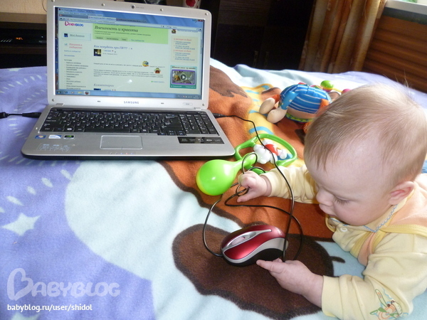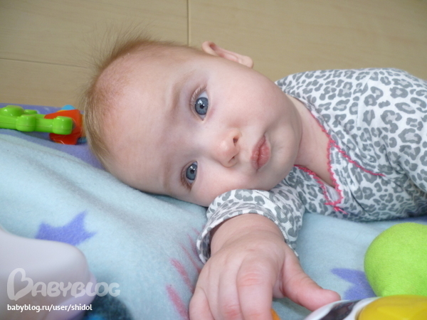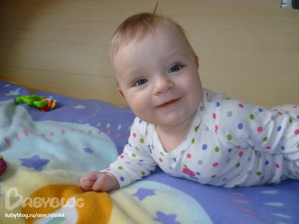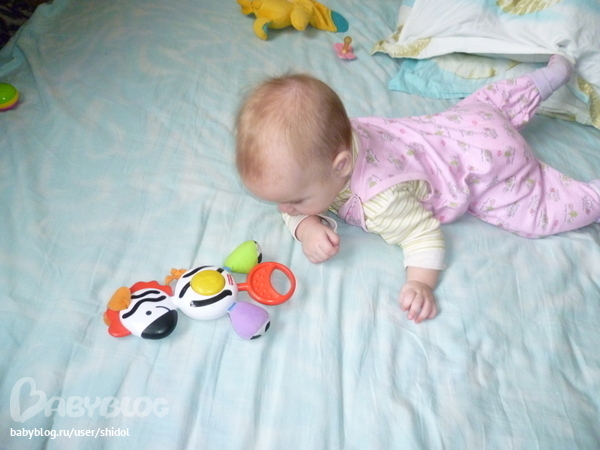 Сейчас я подросла уже.Умею переворачиваться во все стороны,с живота на спину и обратно,стою на четвереньках и раскачиваюсь.У меня есть 2 нижних зуба.Говорю 2 слога Пу-Па…Очень люблю играть в игрушки,особенно в музыкальные,мечтаю завладеть мышкой компьютерной...