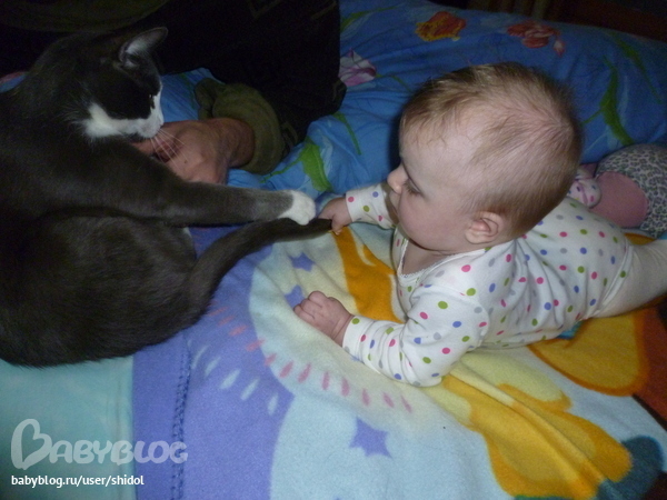 Мама кормит нас кашей и овощами,я кушаю хорошо…ням-ням…А еще я обнаружила кота,какой же у него заманчивый хвост!!!!!!