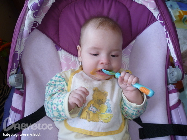 У меня 2 нижних зуба,их уже видно,когда я улыбаюсь)))Люблю все погрызть-ноги свои,руки,рукава,игрушки,пару раз покушалась на мамин ноутбук.Самое вкусненькое-свои голые ножки.Мама и меня кормит кашами и овощами,каши я люблю,а вот овощи меньше…