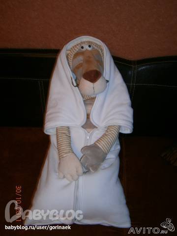 О размерах. Вещи меньше 56 размера брать не стоит, производитель не учитывает памперс. Не люблю, когда вещь рост в рост и памперс прижат к попе. А если надумаешь брать распашонки (мне кстати было удобно первое время распашонка+ползунки), то НИ ЗА ЧТО НЕ БЕРИ РАЗМЕР В РАЗМЕР, они садятся!!! Я и девчонки, скоторыми общаюсь о малышах, сильно обожглись на этом, набрав распашонок в размер. Я брала их зимой и брала из футера (ткань с начесом), но говорят, что и не из футера садятся на раз-два. О тканях. Флис дома не нужен однозначно! Пары велюровых комбезиков хватит, но я вообще против кутания. У нас были просто хлопковые тоненькие комбезики. О рукавах с отворотом. Мне было удобно, когда рукава просто зашиты (есть и такие!), использовала такую одежду первую неделю жизни, потом просто чаще стригла ногти и ручки всегда были на свободе. Носочки. Толком никогда их не носили, т.к. Егор их постоянно снимал и снимает. Пригодились на массаже и вот сейчас в коляске.  Если вернуть время назад, купила бы носочки с игрушками для развития малыша. Слюнкявчики. Мы не пользовались и даже с вводом прикорма не пользуемся. Покушал - умываю его, а майку в стирку. Мешочек. Нашла в интернете наглядное фото нашего спального мешочка. Вот он в интернете, только на московских сайтах найти не могу http://www.kpoxa-shop.com.ua/  Мы просто в детском магазине его обнаружили.