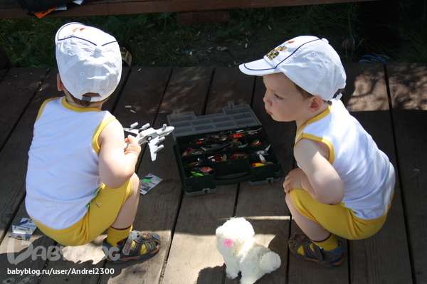 Детки, приехав, озадаченно смотрят на удочки и в очередной раз показывают папе как летает самолетик.