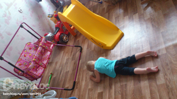 На первой фотке, ребенок только проснулся, и видать от радости решился поплакать на полу.