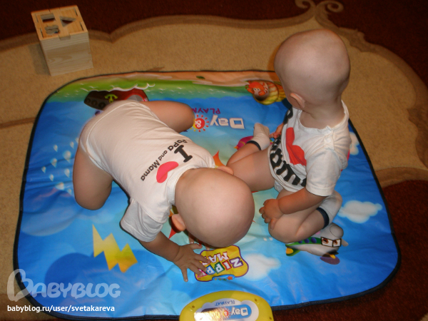А нам тоже такой же музыкальный коврик подарили еще в 8 мес., лазят по нему:))) Только мы батарейки сейчас вытащили, а то там звук очень громкий-надоел нам :)))