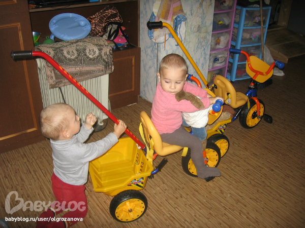 Серафим всё норовит покатать Семёна! и часто переворачивает его вместе с великом, поэтому дома сейчас сняла и ручку и корзину, прицепила только для фоток))) сиденья отодвигаются чуть чуть подальше и тогда до педалей почти не достают, колеса прорезинены - недребезжат, довольно крепкие велики, надеюсь лет до 3 хватит)))