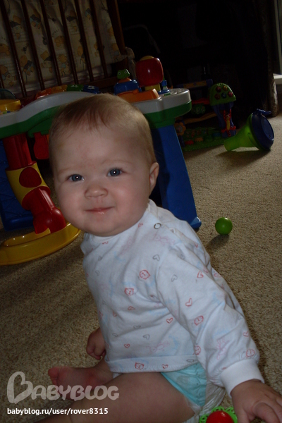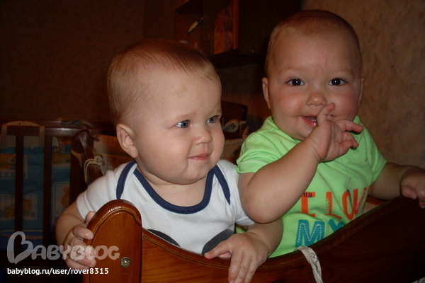 Иришка 8700, рост 71 см, наша капризуля одним словом капризов за день столько, что голова к вечеру кругом. Любит СИДЕТЬ И СИДЕТЬ на руках, книжки смотрит с большим удовольствием, чем братик, все игрушки тянем в рот, зубов пока нет ни одного вот все ждем. Наша главная игрушка сейчас это соска, кто бы мог подумать, с рождения нафин не нужна была, а сейчас в числе первых, ест хорошо, съедает больше Андрея. Спать, переодеваться, гулять все со скандалом. Тоже ползает, ходит вдоль опоры, дерется с братом и рвет, все что найдет. Очень серьезная девочка, папина любимица. Столько радости, когда его видит, просто не может удержаться. Вот такие разные дети, общего нет ничего