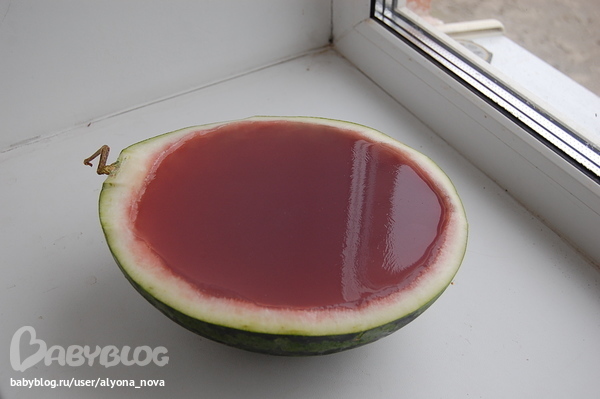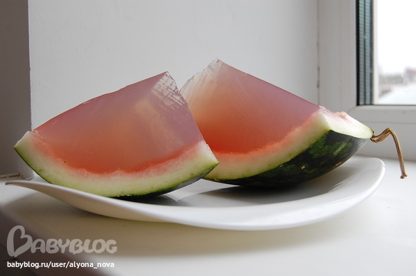Нужно: очистить половинку арбуза, развести желе согласно инструкции, залить в форму и поставить на ночь в холодильник.
