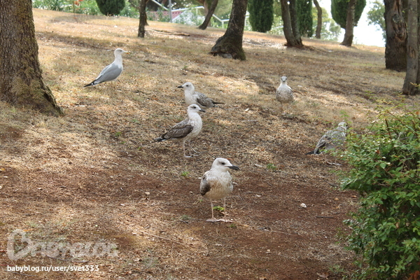 Чайки...Отдельная тема!!! Они НЕ ЕЛИ хлеб!!! Орали с 8:00 под балконом! Дрались из-за куриной кожи, Мяса молодого поросенка, креветок, жареной рыбы, сосисок, сыра, колбасы! На фото такие милые...На самом деле они реально ростом с поросенка молодого...Те что серенькие - самцы, отгонявшие самок от еды...Как они их клевали!!!...