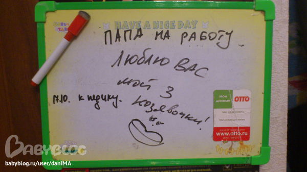 Наш папсик пришел в обед домой и к 5 часам надо было бежать снова на работу, и когда же мы пришли с гулянок, я увидела вот такую надпись :))) так прикольно :))))