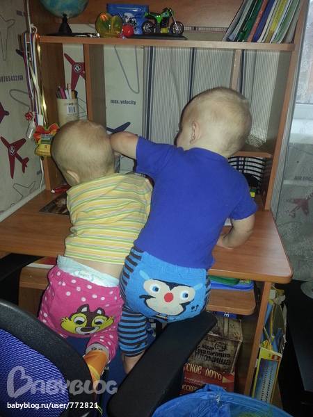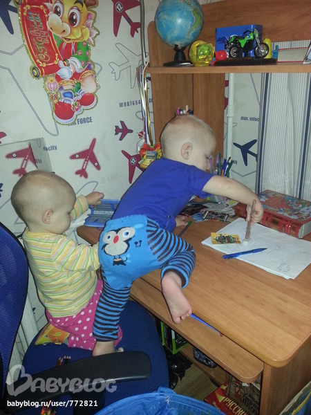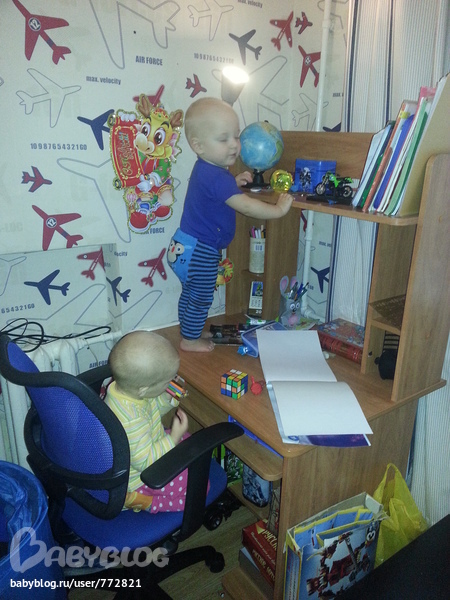 Димка не лазит а Ден просто везде, мне иногда кажется что Денис просто везде! он один хулиганит за 3!))) Старшая с малым сидят книги листают, мульты смотрят, а это как стихийное бедствие! где прошел там погром)))