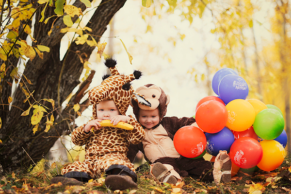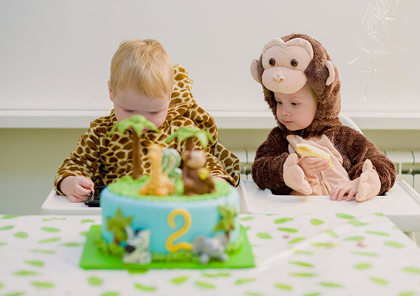 Праздник мы затеяли в стиле Джунглей. Детей нарядили в костюмы Жирафа и обезьянки.